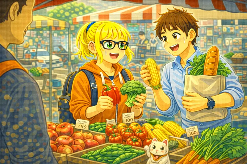 Anna idzie na targ w sobotę rano. Kupuje jabłka, banany, pomidory, marchewki i świeży chleb. Rozmawia ze sprzedawcami i płaci za zakupy. Anna jest zadowolona ze swoich zakupów i uwielbia chodzić na targ co tydzień.
